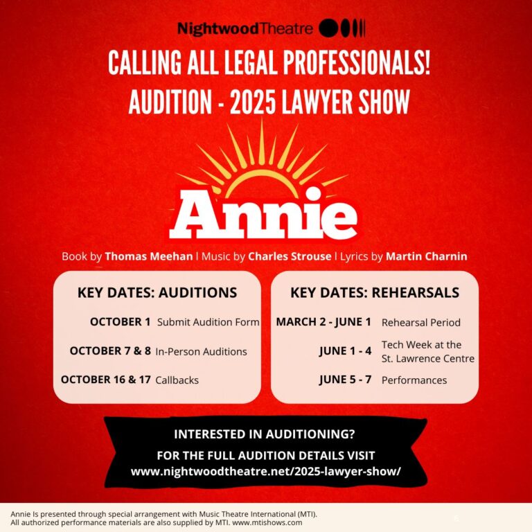 The Nightwood Theatre would like to share their Call to Audition for the upcoming Lawyer Show! The Nightwood Theatre will be doing ANNIE for the 2025 musical and auditions will take place at the beginning of October. The Nightwood Theatre is hoping to expand their reach to the law professionals in the GTA who might be interested in this opportunity. This will be the 16th annual Nightwood Lawyer Show!