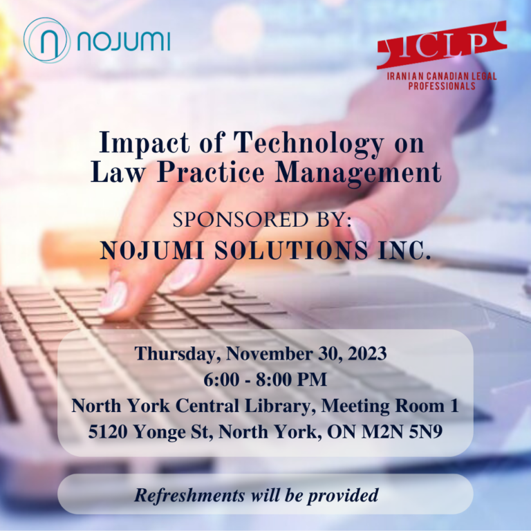 This event will be sponsored by Nojumi, a legal tech company offering practice management solutions to lawyers in Ontario. Nojumi was built by lawyers for lawyers with the practical needs of a busy legal practice in mind. Learn more about Nojumi here: http://nojumi.com.